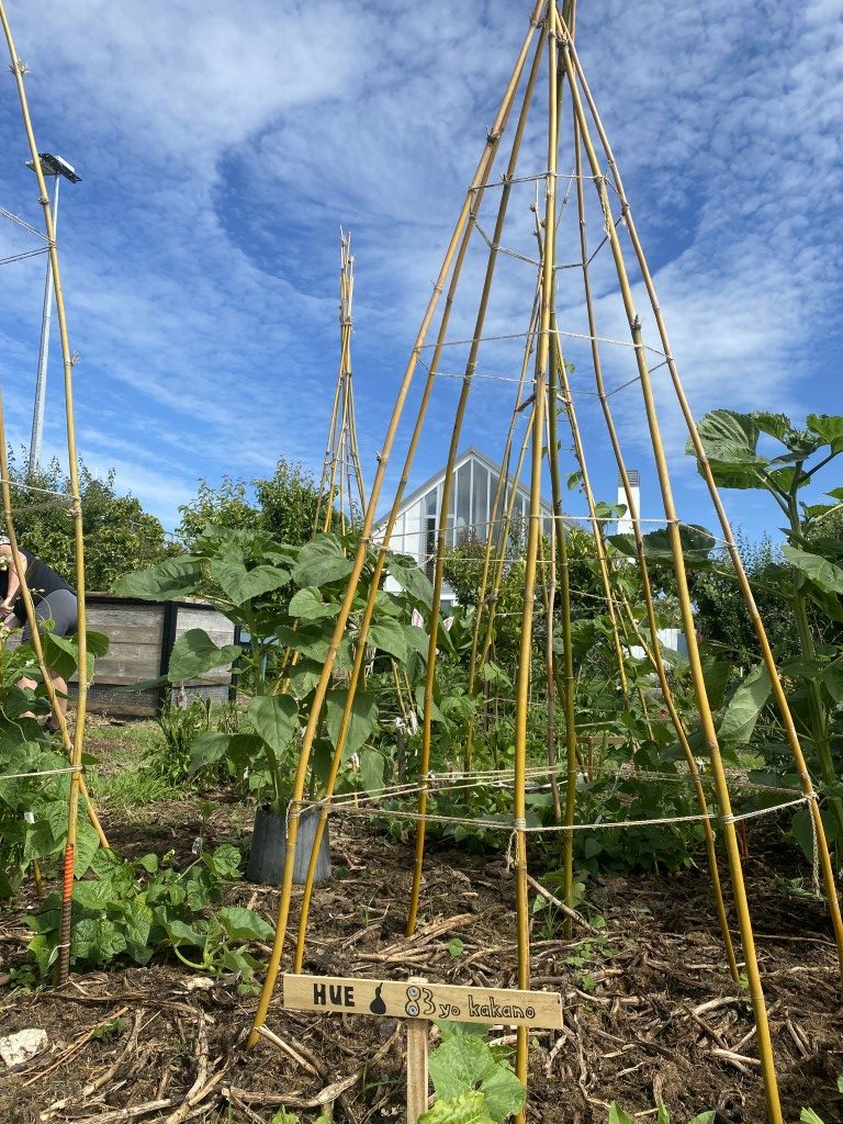 There’s been exciting progress in the māra. Last week we celebrated our new compost tower, and now we’ve gained another structure — a beautiful shade sail floating over the circle.