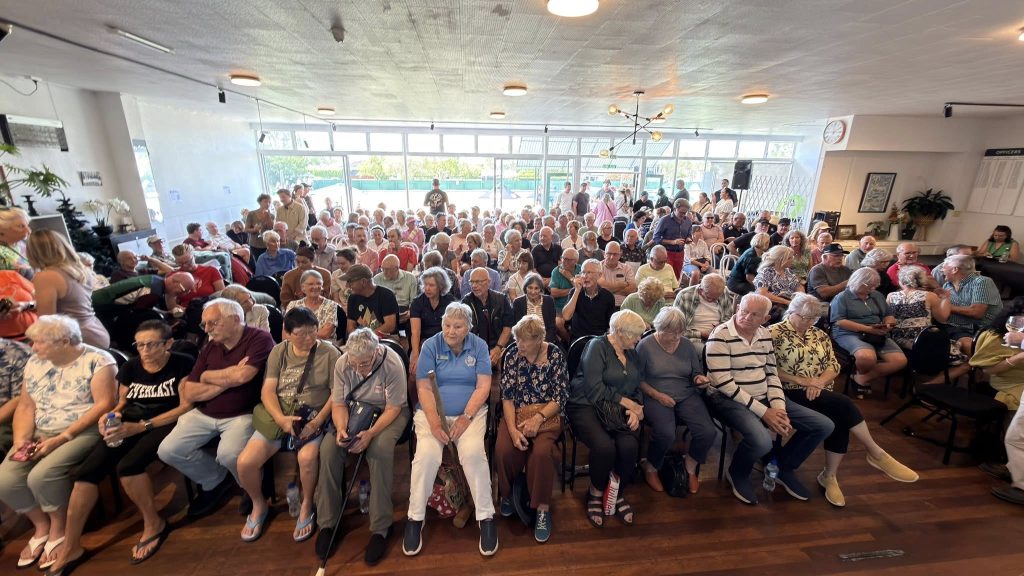 Today many of our members showed up for the meeting at the Bowling Club regarding the contested land ownership. We arrived to a side room completely packed, overflowing onto the outdoor seating and playground. More than 200 people attended!